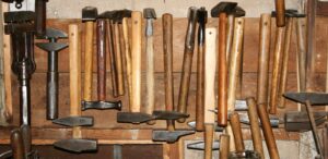 Zwischen den beiden Fenstern befindet sich ein offenes Regel mit Rauhbänken, Meißeln und weiterem Werkzeug. Darunter hängen verschiedene Hämmer.