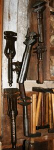 Am Hängeregal links hängen Engländer und Franzosen, stufenlos verstellbare Schlüsselzangen, die gebraucht wurden, um die vor dem Aufkommen der industriellen Norm unterschiedlichen in Einzelfertigung vom Schmidt hergestellten Muttern zu greifen.