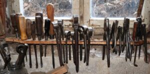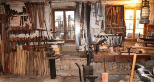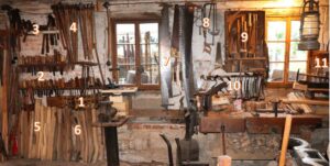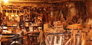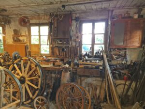 Vor der Werkbank steht rechts eine Kiste mit Keilen für das Spalten von Sterholz. Links daneben stehen Löffelbohrer, mit denen vor der Anschaffung der Buchsenlochfräse die Löcher für die Buchse als finaler Akt in der Radproduktion eingebohrt wurden. Neben der Granitplatte (hinter der geöffneten Tür) stehen große Vorschlaghämmer und Eisenaufsätze, mit denen die Buchse auf der Granitplatte in das fertige Rad eingetrieben wurde.