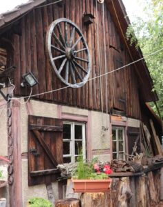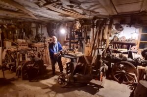 Im derzeit nicht zugänglichen Anhängeschuppen steht die Hobelmaschine und befindet sich auch die “Radgrube”, in der Wagenräder eingespeicht wurden.