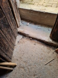 Der Schutt aus dem zerbombten Wohnhaus hat die gesamte Fläche in diesem Bereich um etwa 30-40 cm angehoben, was man am Eingang zur Werkstatt erkennen kann. Wo vorher ein ebenerdiger Zugang war, ist heute eine Stufe abwärts, die keinen barrierefreien Zugang in die Werkstatt mehr bietet.
