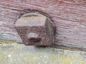 Wenn man die Werkstatt betritt, sieht man am Türpfosten rechts unten die Mutter einer Eisenarmierung, die Türpfosten und Eckpfosten des Gebäudes zusammenhält. Sie ist eine für die damalige Zeit typische handwerklich vom Schmied in Einzelanfertigung hergestellte Vierkant-Mutter.