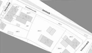 281/1 ist das jetzt noch bestehende Grundstück. 281/2 und sowie 281/4 sind die verkauften Grundstücksteile an der Ecke zur Kirchstraße. 281/3 ist die an die Gemeinde verkaufte Fläche für die Eisenbahnstraße. An der Kirchstraße und an der Rathausstraße befinden sich Bahnübergänge.