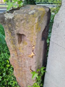 Die Begrenzung zur Bahn hin bestand damals aus Sandsteinsäulen mit dem quadratischen Querschnitt von etwa 25×25 cm und einer Länge von etwa 2 Metern mit eingehängten Holzgattern. Der Abstand zwischen den Sandsteinpfosten betrug etwa 4 Meter und die Holzgatter waren per “Bajonett” eingehängt. Von diesen Sandsteinpfosten befinden sich noch welche auf dem Grundstück, einer direkt am Backhäuschen.